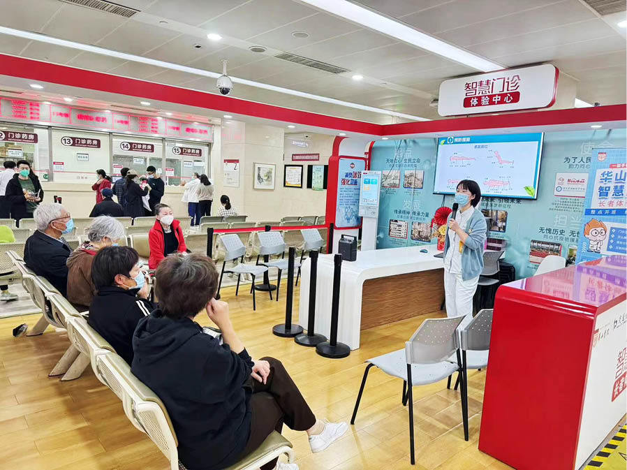 在推進新技術(shù)應用的同時,華山醫(yī)院充分考慮到目前還不能熟練使用智能設(shè)備的老年患者。在華山醫(yī)院門診二樓,每天都有公益性的課程,志愿者手把手教患者熟悉醫(yī)院看病流程,幫助老年患者方便就醫(yī)。